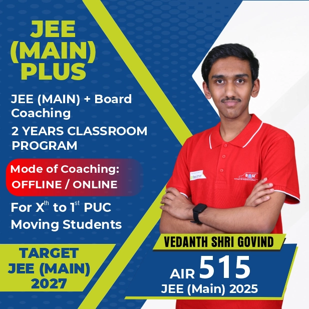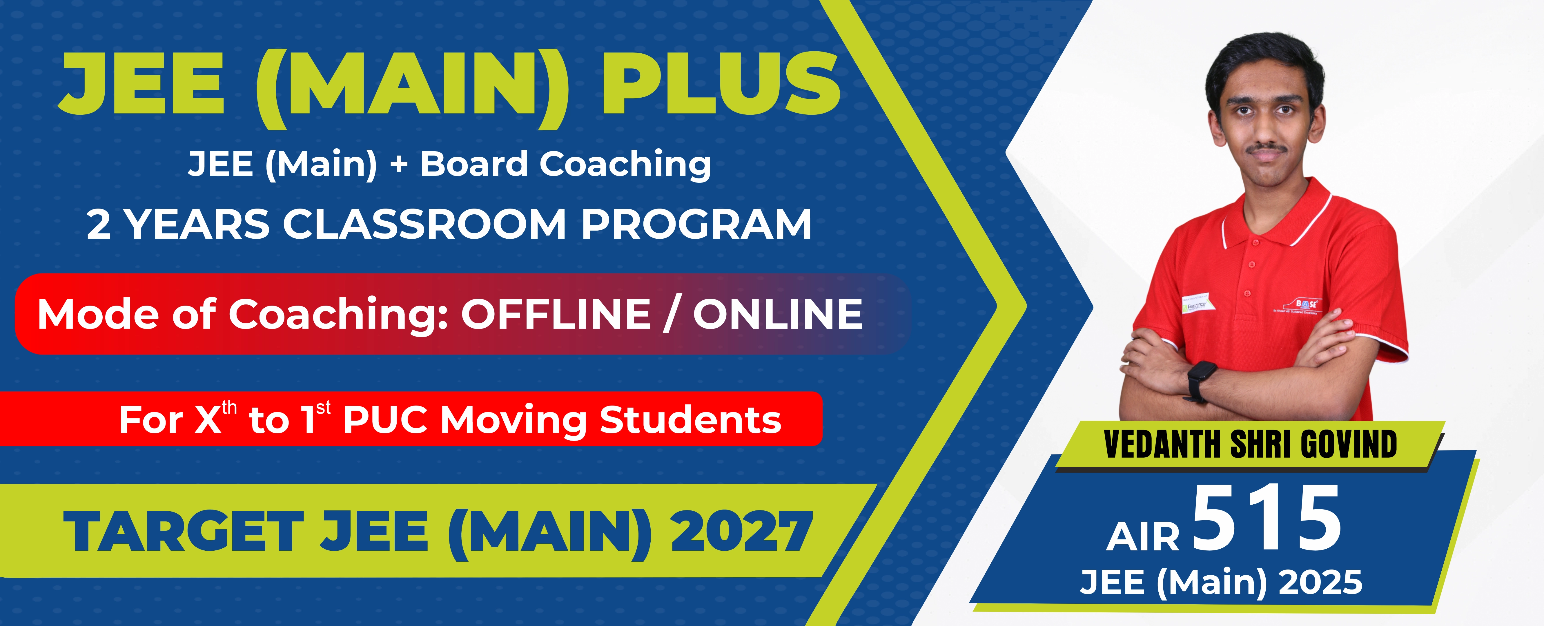 JEE Main Plus is a 2 Year program. It enables students to achieve excellence with the perfect balance in study approach. The program is meticulously designed to help students prepare for PU Board exams as well as national level competitive exams like JEE Main. Over the years, some of the best ranks in JEE Main & Advance has been claimed by the students attending this program.